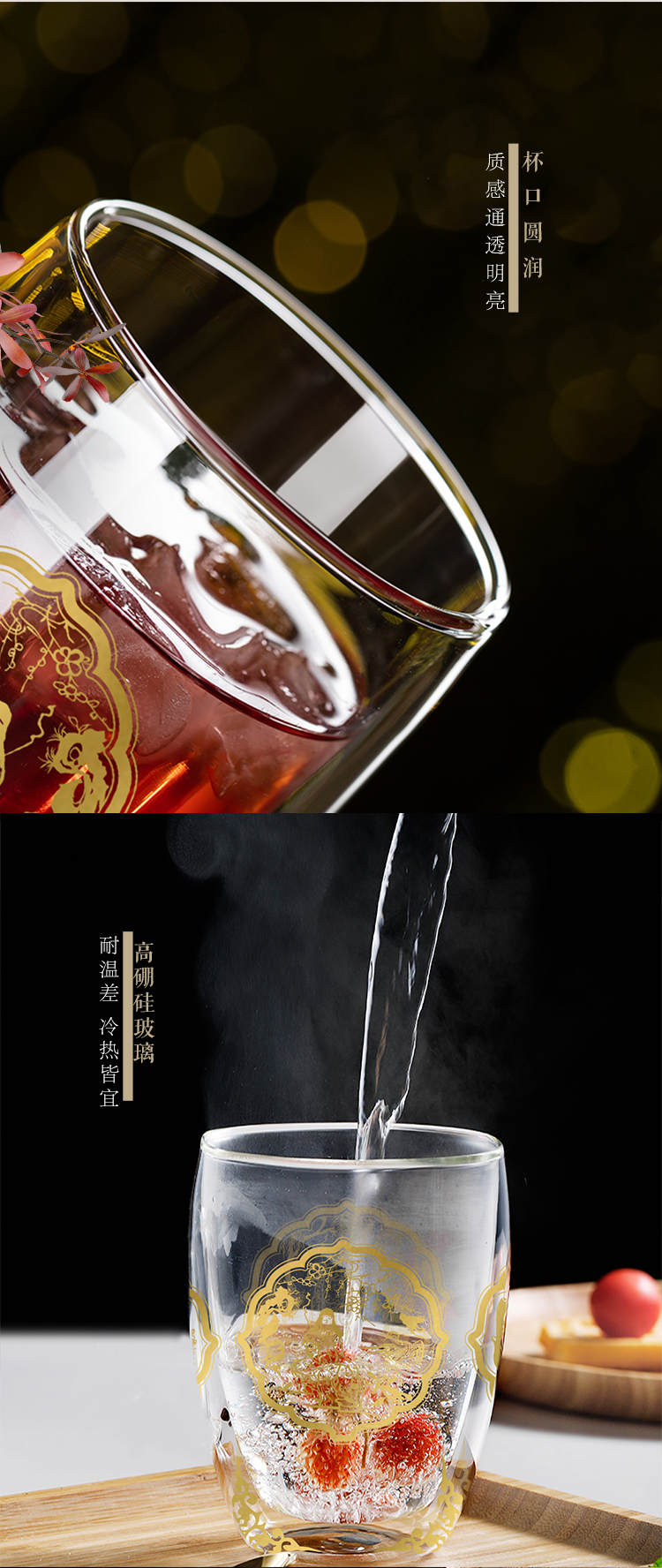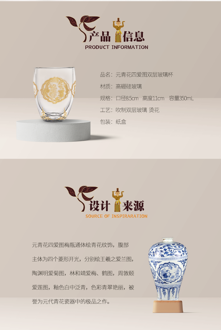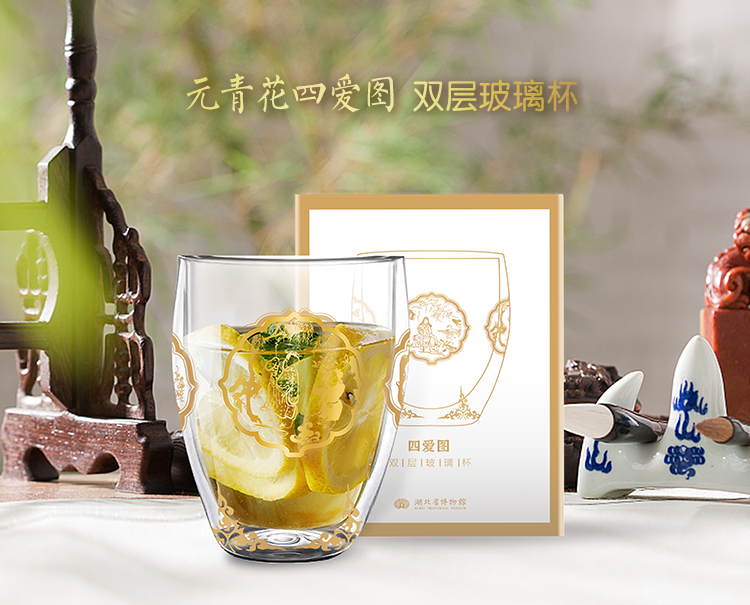 双层玻璃杯是一款防烫手、颜值高的实用型家居生活产品,结合省博馆藏文物“元青花四爱图梅瓶”,提取丰富的图案元素,搭配烫金工艺,使玻璃杯更具观赏价值。